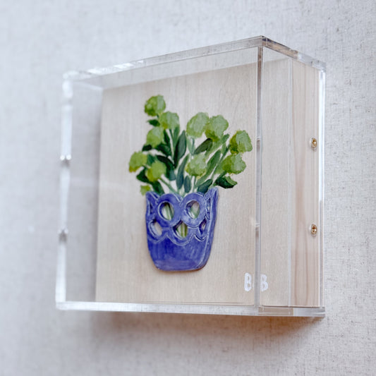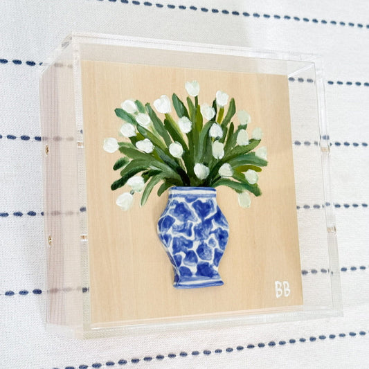 Handmade Ceramic Vase with Original Painted Floral Acrylic Shadowbox - Tulips in Blue Vase | 6x6x3