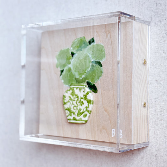 Handmade Ceramic Vase with Original Painted Floral Acrylic Shadowbox - Green Vase with Green Hydrangeas | 6x6