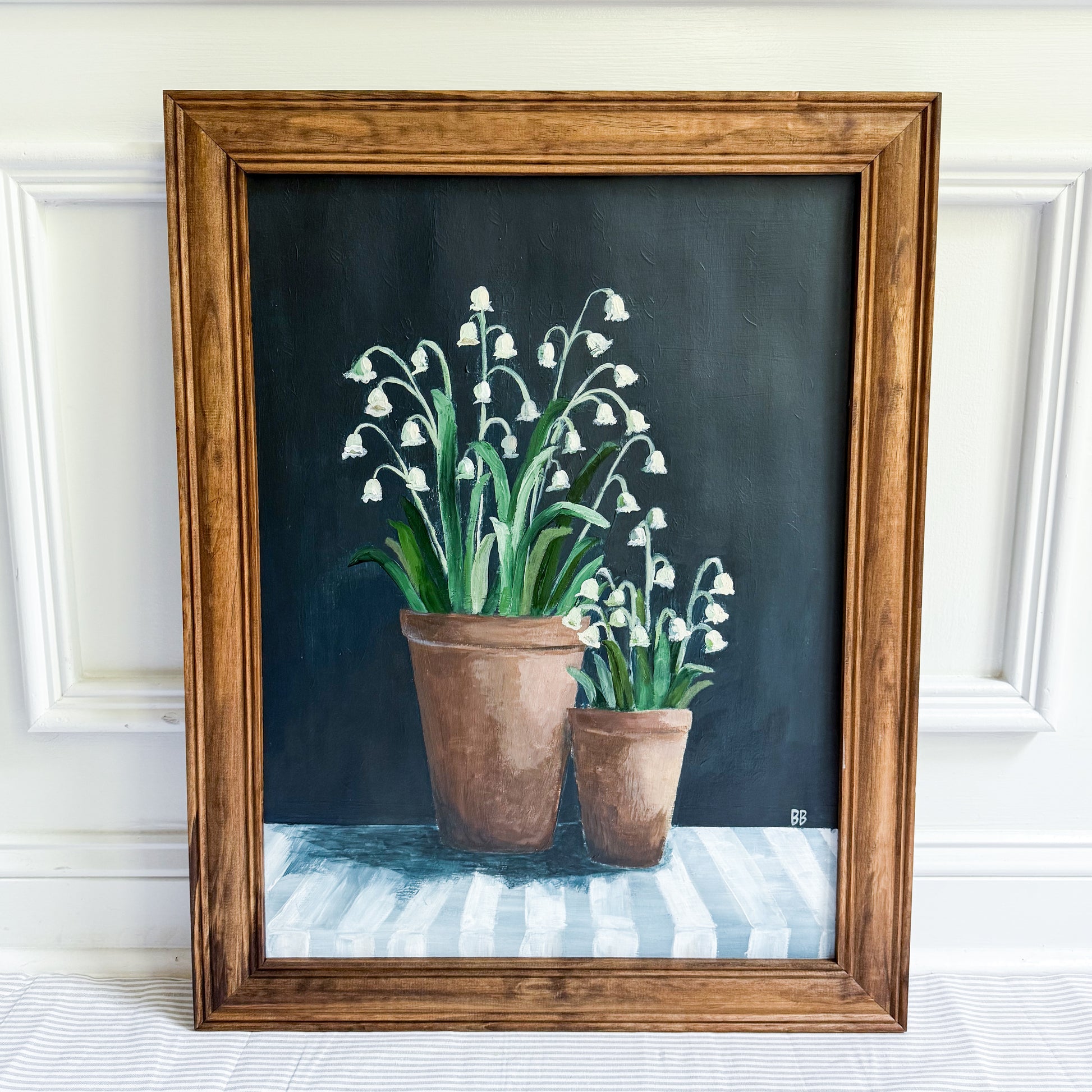 This piece features tiny bell-shaped lilies in terra cotta pots gently arching against a backdrop of a deep midnight blue color and seated on a blue and white striped table cloth.