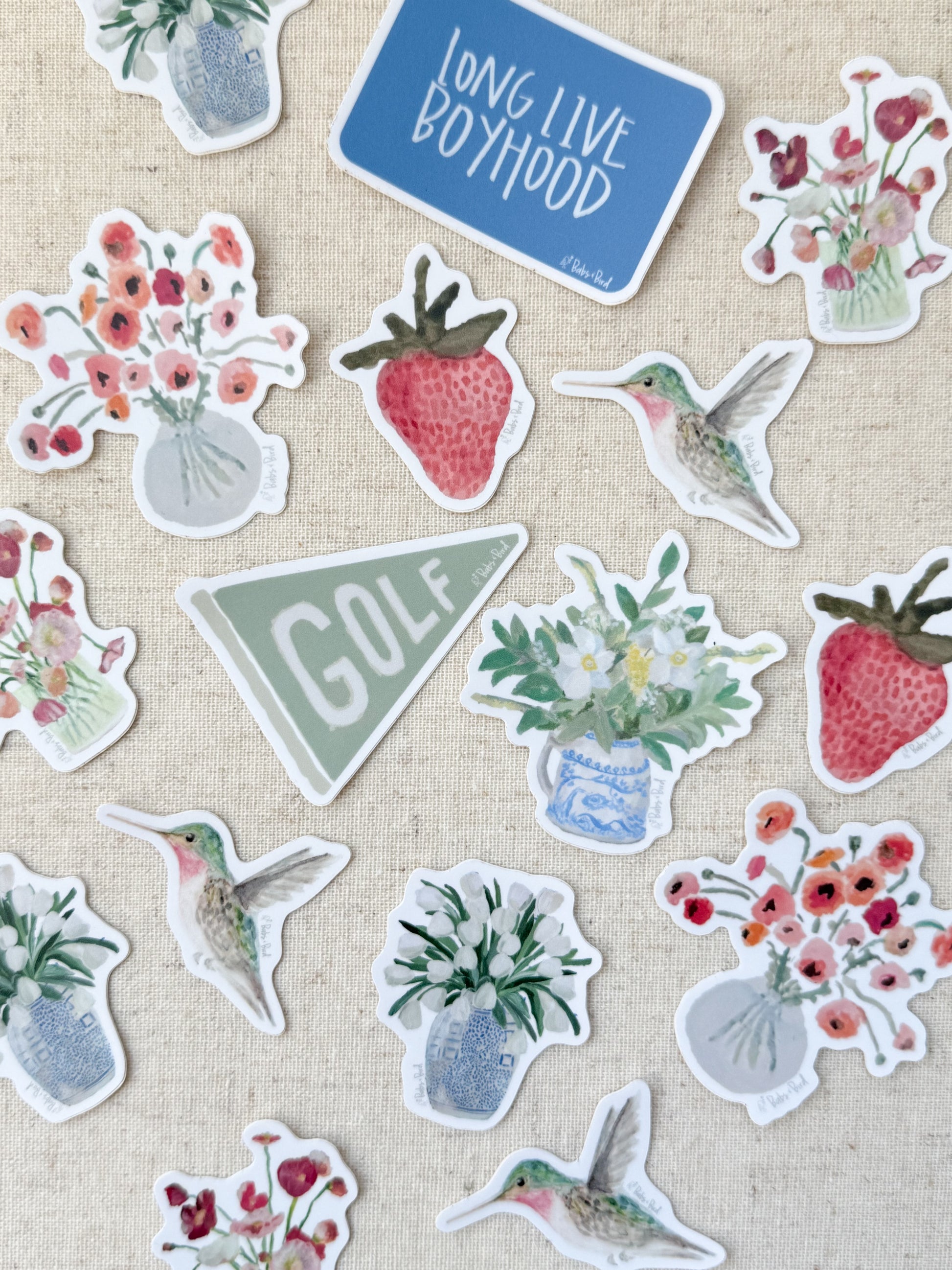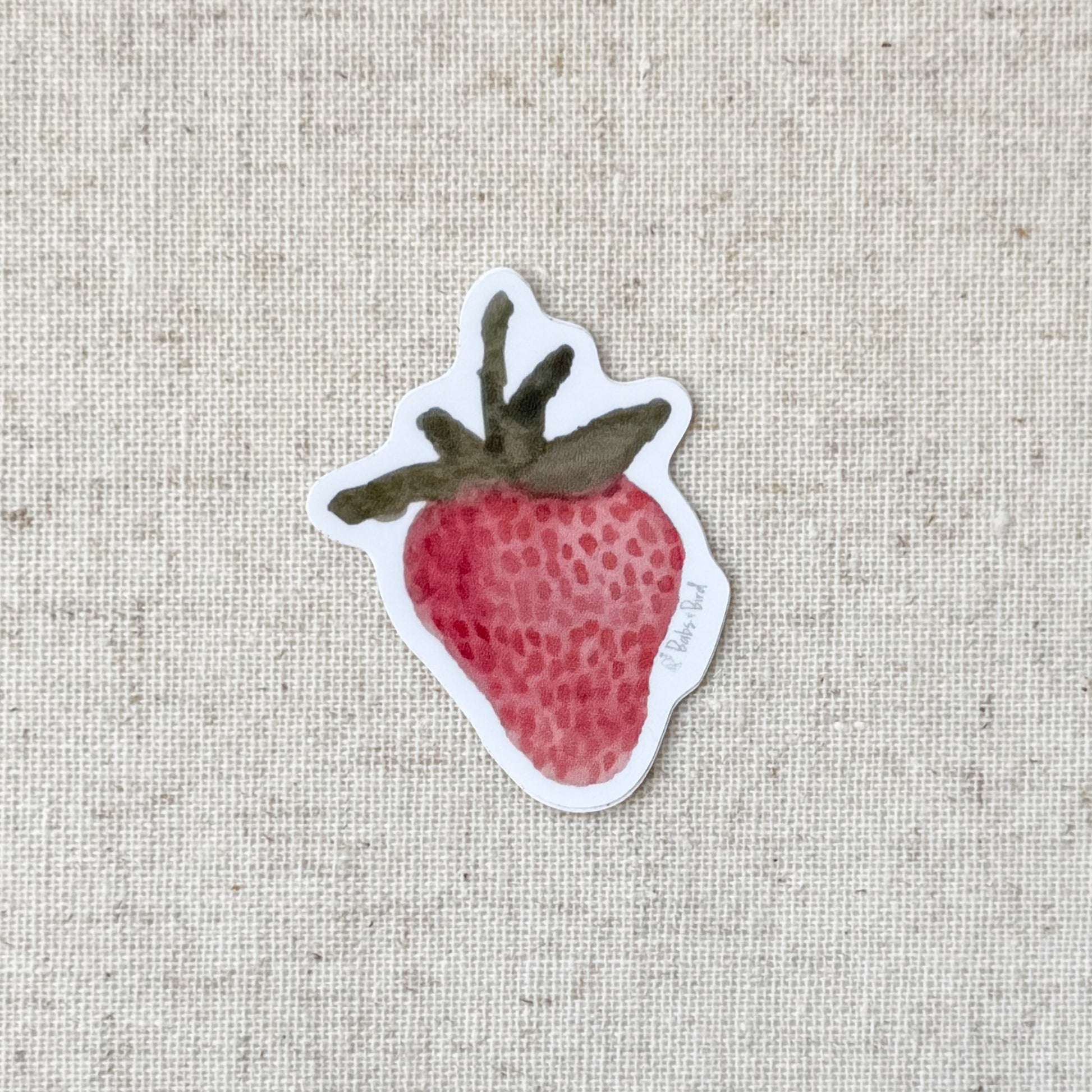 This 2” sticker features a petite print of original Babs&Bird watercolor strawberry.